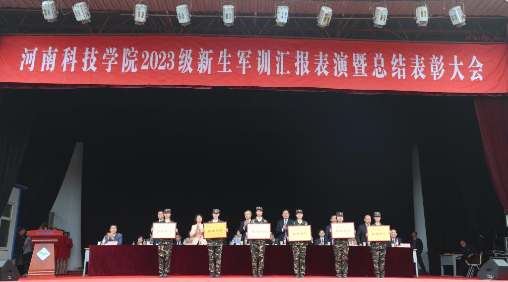 副校长王霞、刘全永分别宣布了2023级军训先进单位和先进个人获奖名单,与会领导为获奖单位和个人颁奖。