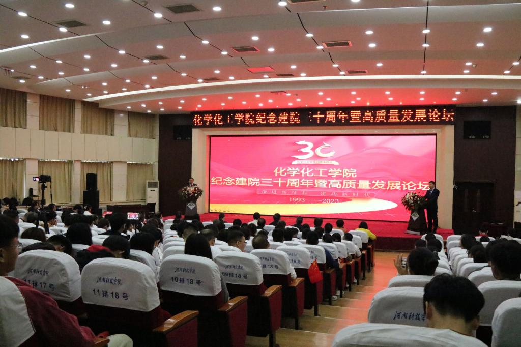 三十年栉风沐雨,三十载春华秋实。10月2日,化学化工学院在行政楼308会议室举办了庆祝建院三十周年暨高质量发展论坛。副校长刘全永出席大会。化学化工学院历任老领导、老专家、老教授,来自全国各地的优秀化工校友,在校师生代表共300余人参加了大会。河南大学、河南师范大学、洛阳师范学院、新乡学院等省内兄弟院校化工学院党政负责同志到会祝贺。大会由化学化工学院负责人主持。