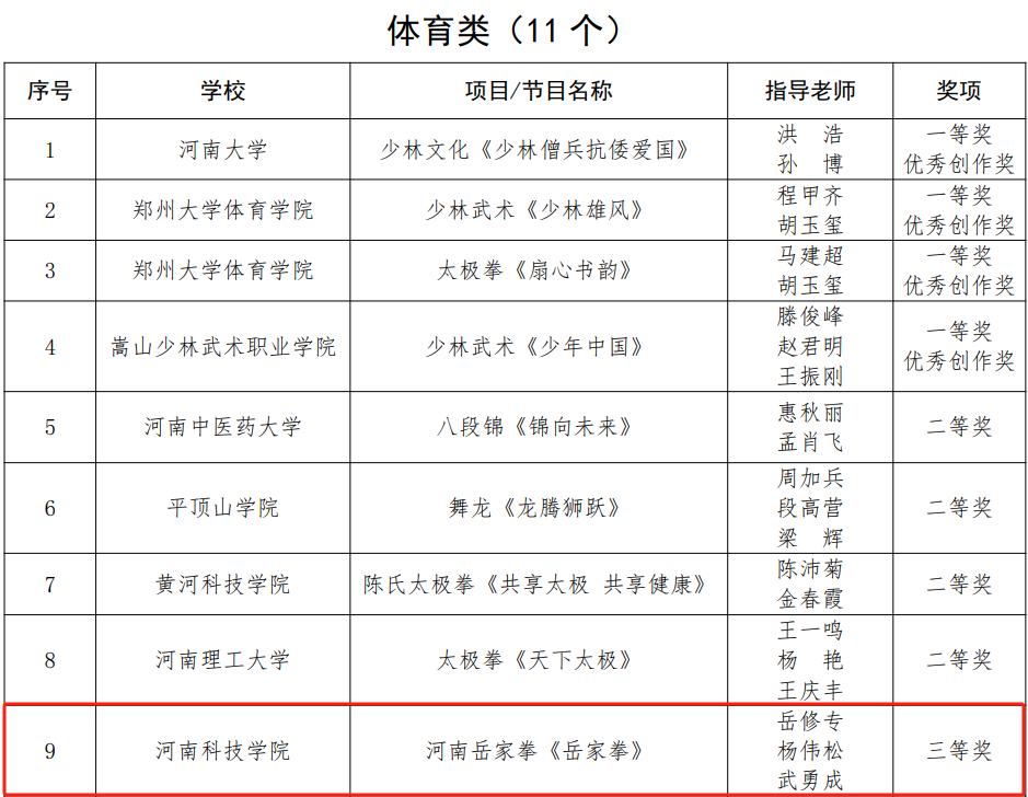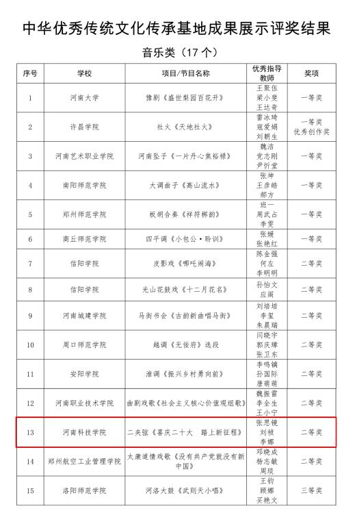 近日,河南省教育厅公示了河南省体育艺术传承项目展示周评奖结果,我校展演作品二夹弦《喜庆二十大 踏上新征程》荣获音乐类二等奖,河南岳家拳《岳家拳》荣获体育类三等奖。活动共评出中华优秀传统文化传承基地音乐类、美术类、体育类奖项44项。