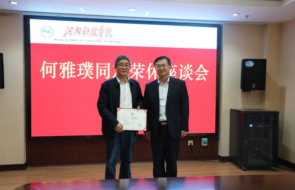 贺杰向何雅璞同志颁发了荣休证书,送上了真挚的祝福。对何雅璞同志为学校的辛苦付出给予了充分肯定,对他的高尚品德、大局意识、无私奉献精神表达了敬佩之情。他谈到,何雅璞同志在学校十个部门工作过,干一行爱一行专一行,始终做到以身作则、兢兢业业、敢说敢管、善教善导,为学校各项事业发展作出了突出贡献,培养了大批优秀学子,感染了众多同事,是学校学生管理工作的实干者和创优者,是学校巡察工作的奠基者和拓荒者,是“百农精神”有力的继承者和传播者。他希望年轻同志要向何雅璞同志学习,传承好、发扬好老一辈科院人开创的“百农精神”,为学校事业发展共同再立新功,也希望何雅璞同志在开启新生活的同时,继续关注学校发展,关心关爱同志们成长。