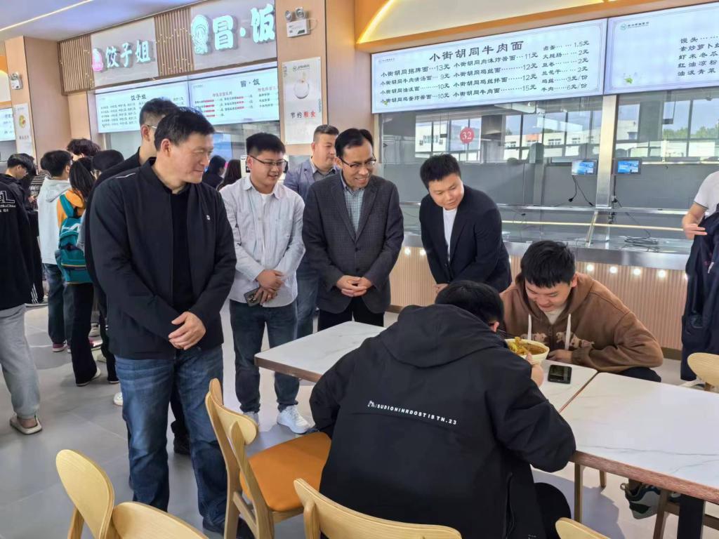 餐厅内人流涌动,同学们在各个窗口前有序排队取餐。姚刚从一至三层认真查看了餐厅空间布局、环境卫生、设施设备、菜品设置等各方面情况。他不时停下来,亲切地与同学们攀谈交流,详细了解大家对饭菜价格、口感口味、服务态度和就餐环境条件等各方面的评价情况。
