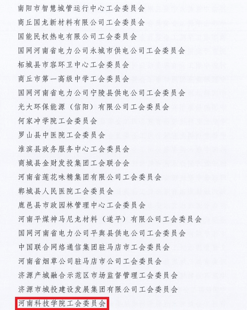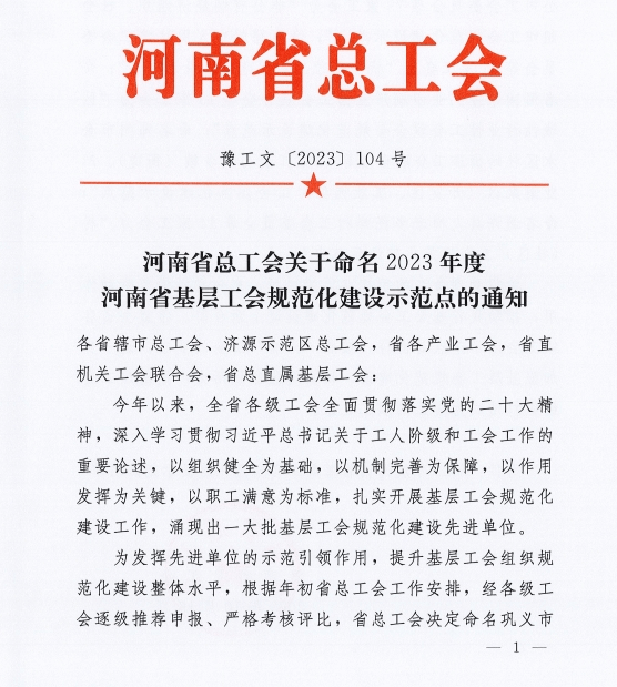 10月16日,河南省总工会印发《河南省总工会关于命名2023年度河南省基层工会规范化建设示范点的通知》,我校工会荣获“2023年度河南省基层工会规范化建设示范点”称号。