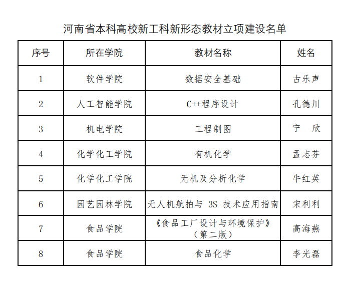 关于公布河南省本科高校新工科新形态教材项目立项建设名单的通知》,公布了一批新工科新形态教材项目立项名单。经高校申报、资格审查、会议评审、结果公示等严格程序,我校申报的《数据安全基础》等8部教材成功获批立项。