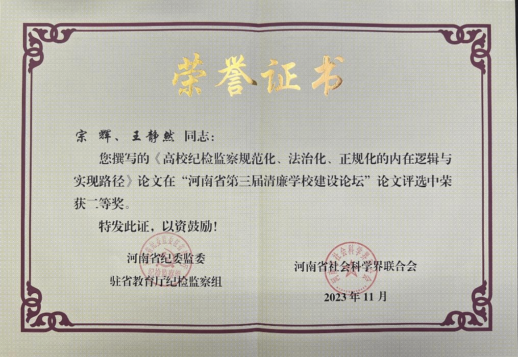 近日,由河南省纪委监委驻省教育厅纪检监察组、河南省社会科学界联合会主办的河南省第三届清廉学校建设论坛征文评选结果揭晓。我校在本次征文评选活动中获得佳绩。