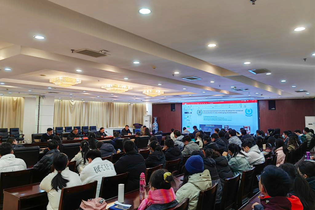 Mehboob-ur-Rahman教授围绕课题组多年来利用基因组辅助育种技术在小麦和棉花育种中的研究进展进行了细致的讲解,并对小麦和棉花生产中的病虫害防控问题进行了深入交流;同时,还介绍了课题组利用生物防治等手段来提高棉花产量和抗逆方面的研究成果,倡导在科研过程中将生物药肥与种质创新工作有机结合,做到种、肥、药一体化。Mehboob-ur-Rahman教授的报告内容丰富、条理清晰、讲解生动形象、深入浅出,对我校今后利用分子生物学技术培育作物新品种具有重要的借鉴意义,并为作物病虫害防控提供了新思路和新方法。