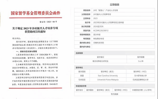 国家留学基金管理委员会于2019年设立乡村振兴人才培养专项。拟申报单位先获得项目单位资格;再向国家留学基金委申报项目,国家留学基金委组织专家评审,确定资助项目及选派类别与规模;项目单位按照获批项目及人选条件选拔推荐人选,经国家留学基金委审核录取后派出。该项目的获批将加快培养一批服务乡村发展、乡村建设和乡村治理的乡村振兴应用型人才,提升我校研究生国际化人才培养能力,为乡村振兴、中原农谷建设贡献河南科技学院力量。