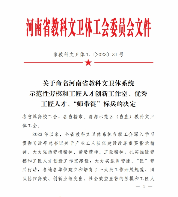 近日,河南省教科文卫体工会下发了《关于命名河南省教科文卫体系统示范性劳模和工匠人才创新工作室、优秀工匠人才、“师带徒”标兵的决定》,我校教师高国红教授荣获河南省教科文卫体系统“优秀工匠人才”称号。