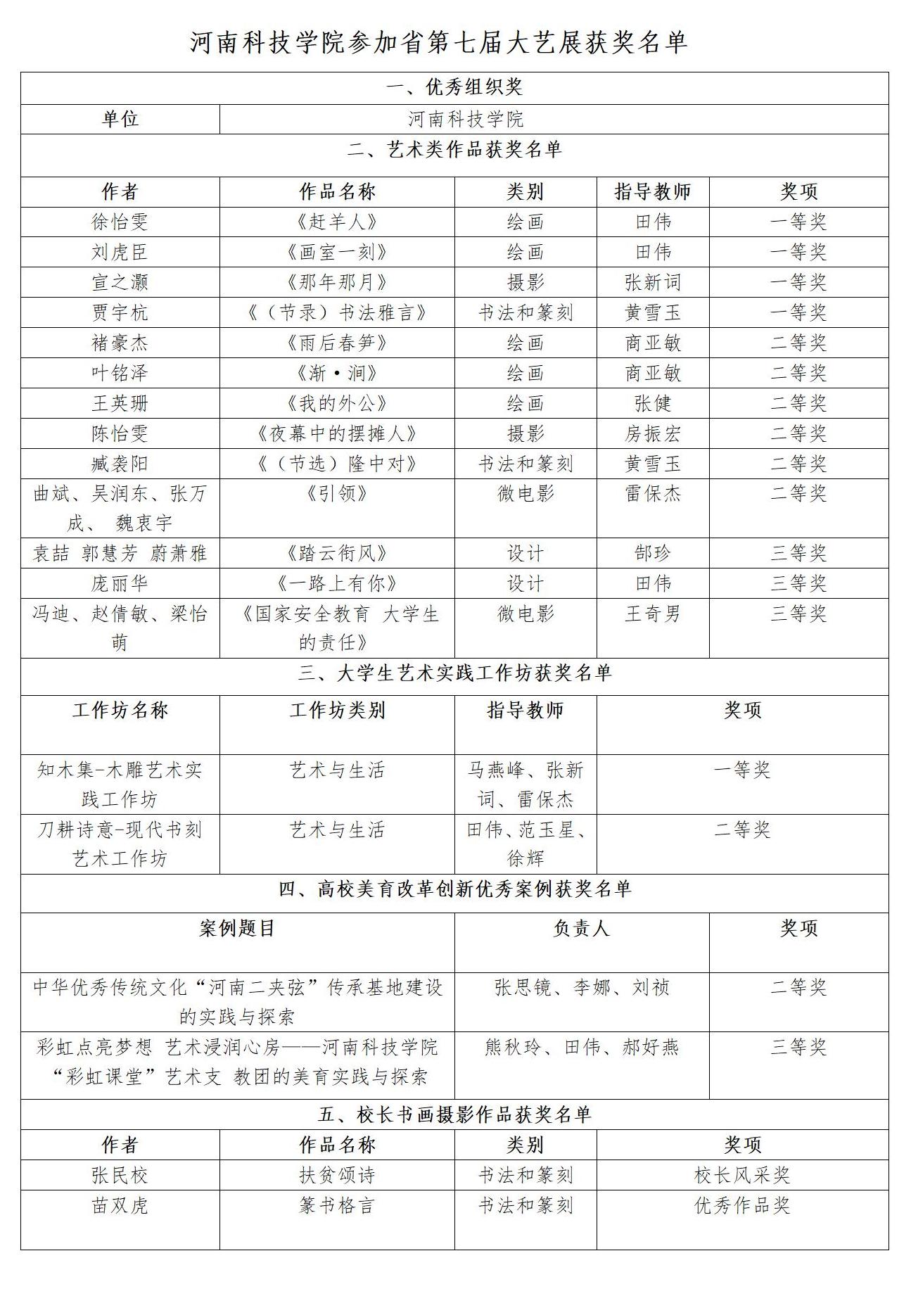 近日,由河南省教育厅主办的第七届大学生艺术展演活动获奖结果揭晓,我校参赛作品表现突出,多件艺术作品喜获佳绩,充分展示了我校美育教育的丰硕成果。本届艺术展演汇聚了来自全省艺术作品、工作坊、美育案例等各类艺术作品共计3000余件。我校荣获省优秀组织奖:获得省级一等奖5个、省级二等奖8个、省级三等奖4个、校长风采奖1个、优秀作品奖1个。《知木集——木雕艺术实践工作坊》和《扶贫颂诗》被选送参加全国大艺展评审。