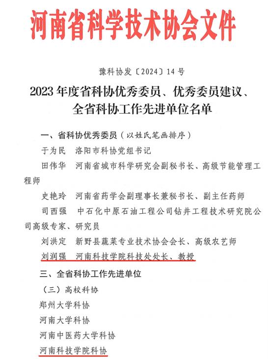 近日,河南省科学技术协会下发了《关于对2023年度优秀委员、优秀委员建议和全省科协工作先进单位进行表扬的通报》(豫科协发〔2024〕14号),我校科协荣获全省科协工作先进单位,我校刘润强教授荣获河南省科协优秀委员。