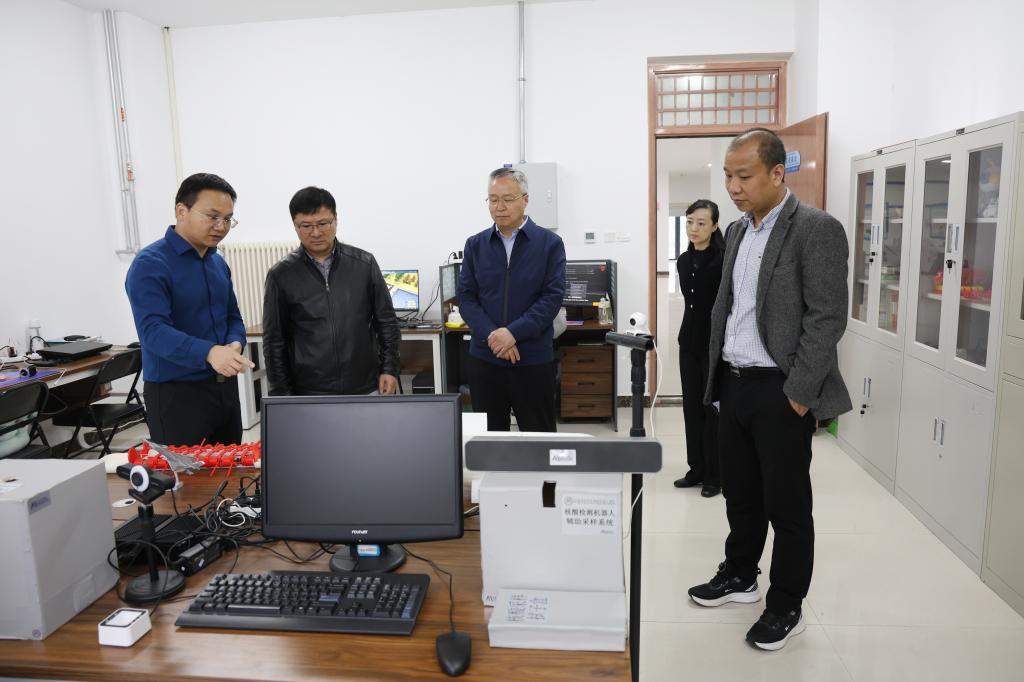 在小麦育种中心,相关负责人向李富根一行介绍了百农3217、百农矮抗58、百农4199、百农5819等小麦品种的选育培育过程,以及人工气候室、核型分析实验室、品质高分析实验室等科研平台。在百泉现代农业研究院,相关负责人介绍了本院的研究领域、组织机构设置及分工、运行机制、以及目前取得的成绩。在人工智能学院,相关负责人介绍了国家重点研发计划智能机器人专项的完成情况,原创性智能机器人,尤其是智能作物生长检测机器人、全自动割胶机器人、以及抗倒伏性状测评机器人等农业机器人的研发过程和应用情况。