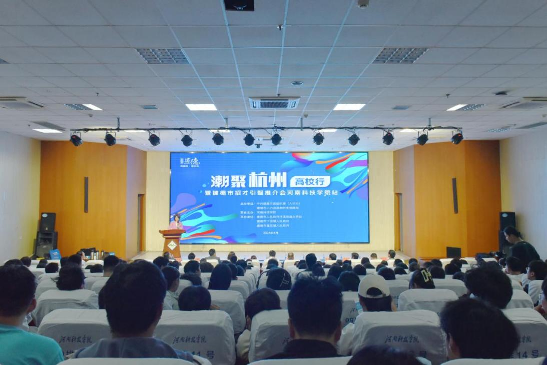 4月17日上午,由我校和建德市人力资源和社会保障局联合主办的2024年“潮聚杭州”高校行暨建德市百校引才推介会暨专场招聘会在新图书馆一楼报告厅举行。河南科技学院副校长丁轲、建德市政协副主席钱晓华,建德市人力社保局党组成员、副局长余丹等校地双方领导出席座谈会,校长办公室、学生处、就业创业指导中心、化学化工学院负责人,建德市人力社保局、洋溪街道办事处、下涯镇人民政府、莲花镇人民政府等乡镇负责人,浙江绿萌环境监测科技有限公司、中策橡胶有限公司等7家建德市知名企业和我校300余名毕业生参加本次推介会。推介会由化学化工学院主持。