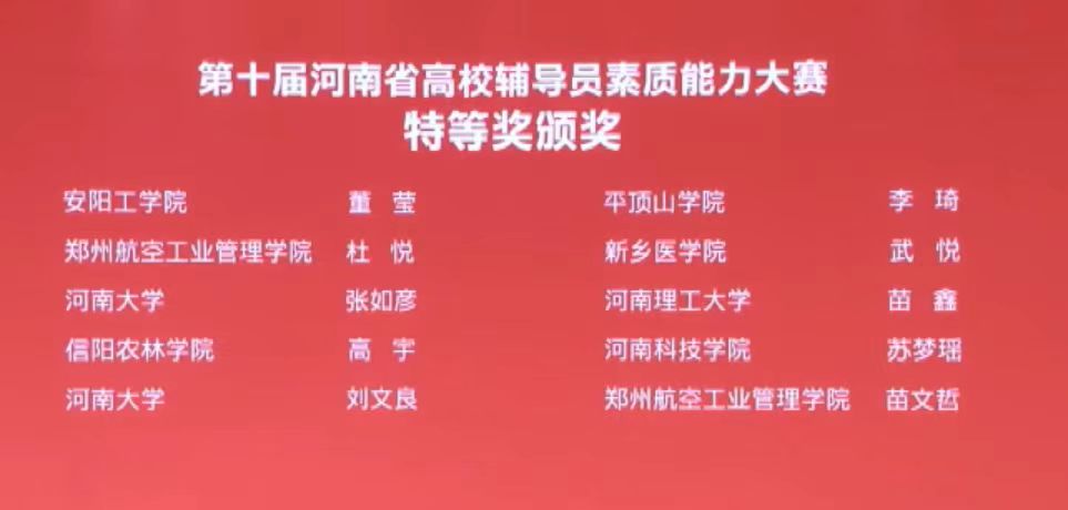 4月23日至24日,由中共河南省委教育工委、河南省教育厅主办的第十届河南省高校辅导员素质能力大赛在郑州航空工业管理学院隆重举行。在这场激烈的角逐中,我校美术与设计学院辅导员苏梦瑶凭借扎实的理论功底、丰富的实践经验和沉稳的竞技状态脱颖而出,荣获大赛特等奖。