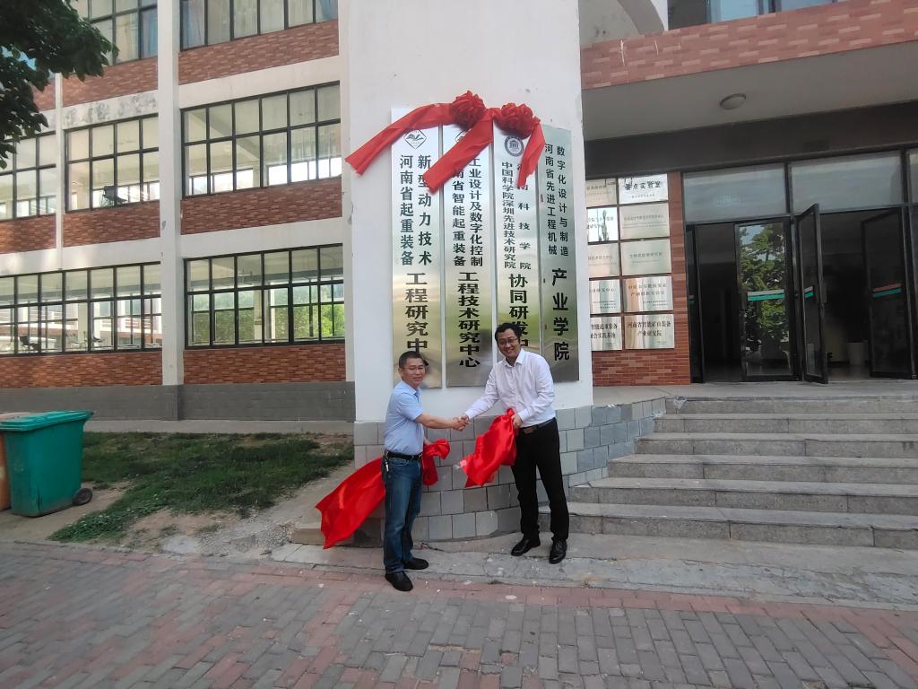 胡铁柱与杨之乐共同为“中国科学院深圳先进技术研究院河南科技学院协同研发中心、机电学院近期获批的河南省智能起重装备工业设计及数字化控制工程技术研究中心、河南省起重装备新型动力技术工程研究中心”揭牌。