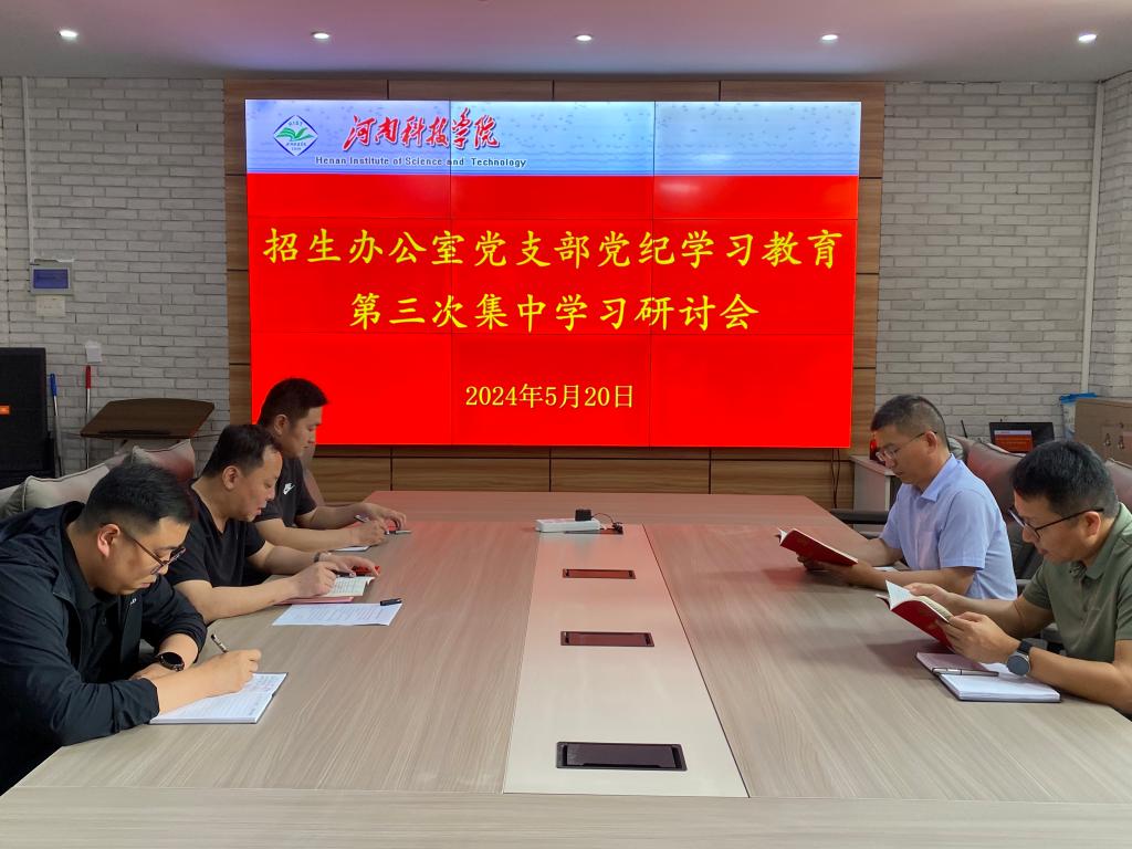 5月20日上午,招生办公室党支部在科研楼B段1101会议室开展党纪学习教育第三次集体学习研讨会,副校长胡铁柱参加本次学习。会议由招生办公室党支部书记主持。