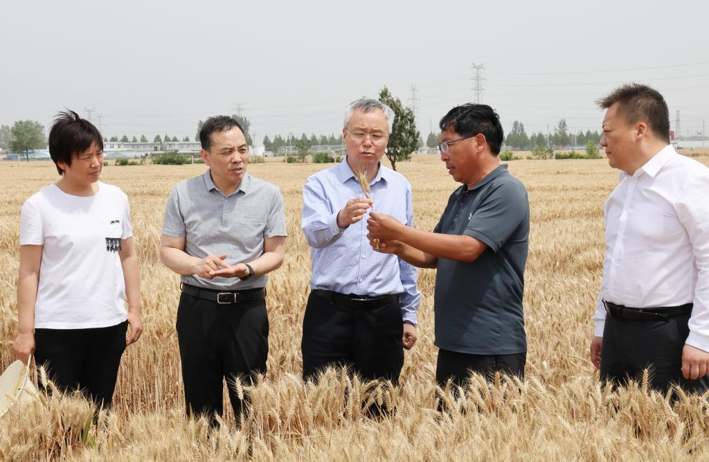 在小麦遗传改良研究中心辉县中小营育种基地,宋亚伟一行与坚守麦收一线的师生亲切座谈,并先后查看了百农277、百农607、百农627等小麦新品种的成熟情况,欧行奇教授详细介绍了小麦最新育种进展、优质专用品种百农627的特征特性以及小麦未来的发展方向。