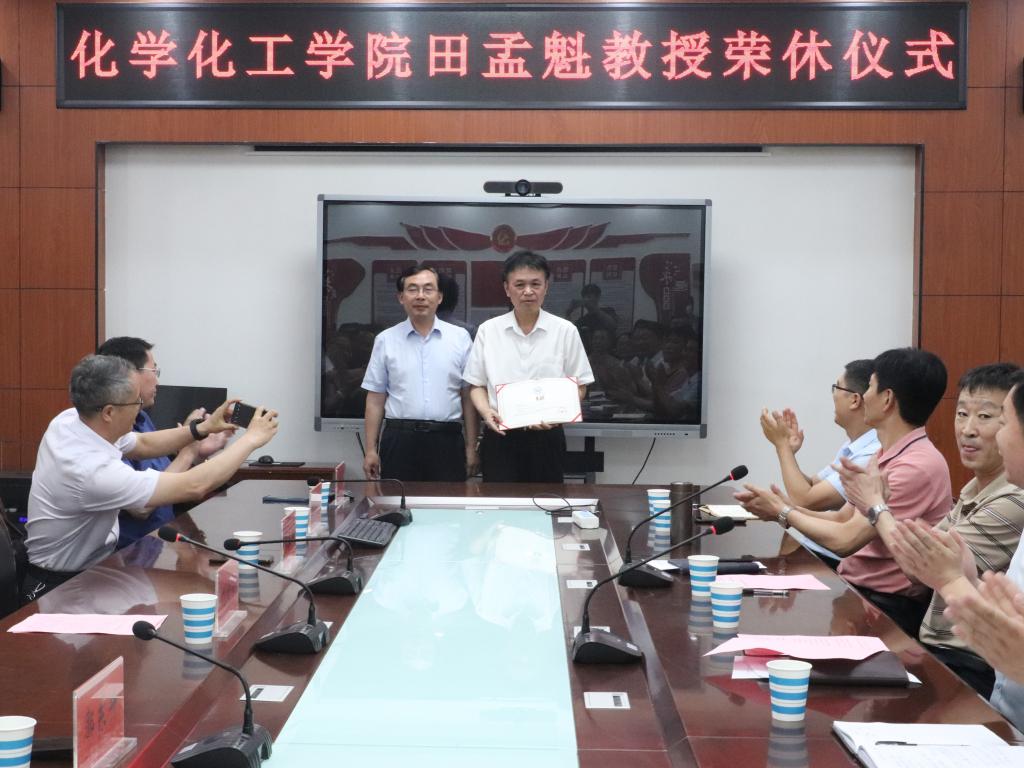 5月30日下午,化学化工学院在会议室举办田孟魁教授荣休仪式。副校长刘全永出席仪式,教务处、继续教育学院、网络与信息化管理中心等单位相关同志,学院班子成员及师生代表参加仪式。仪式由化学化工学院负责人主持。
