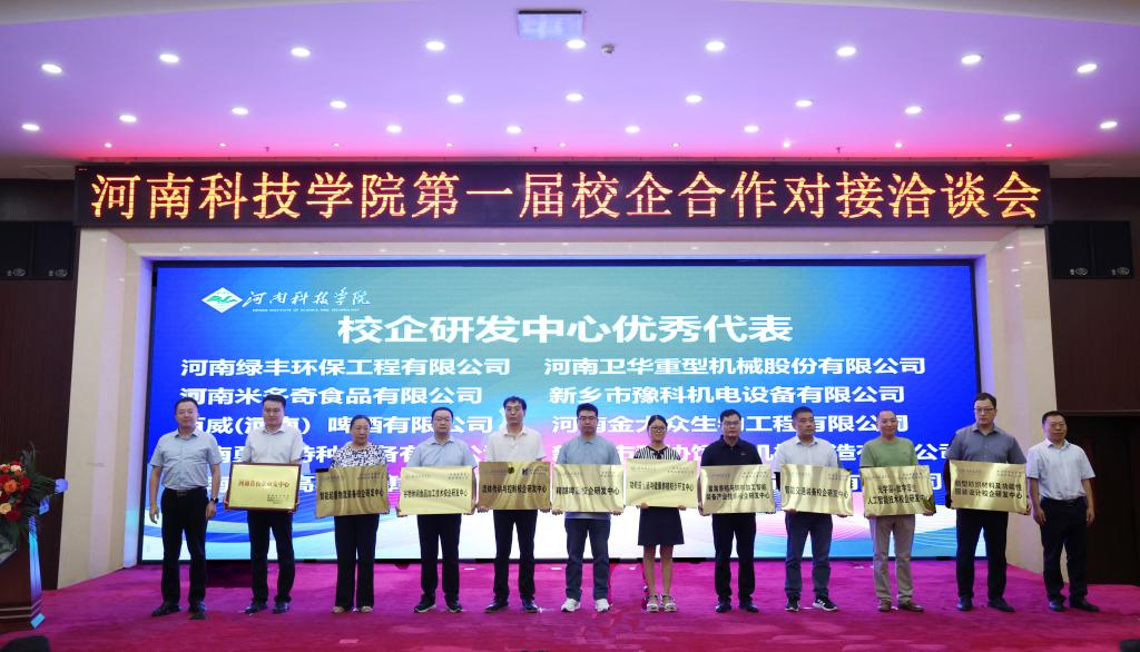出席对接洽谈会的领导为10个“服务地方先进集体”、25个“河南科技学院卓越合作伙伴”、20个“校企研发中心优秀代表”颁奖。农学院负责人代表获奖学院发言,表示将以扛稳粮食安全为己任,培育更多优良品种。袁隆平农业高科技股份有限公司和河南绿丰环保工程有限公司代表企业发言,并对我校提供的技术支持及科研成果表示由衷的感谢,后续将与我校进一步深化合作,推进学校优秀科技成果转化为先进生产力。启动仪式现场还签署了8项校企合作协议。