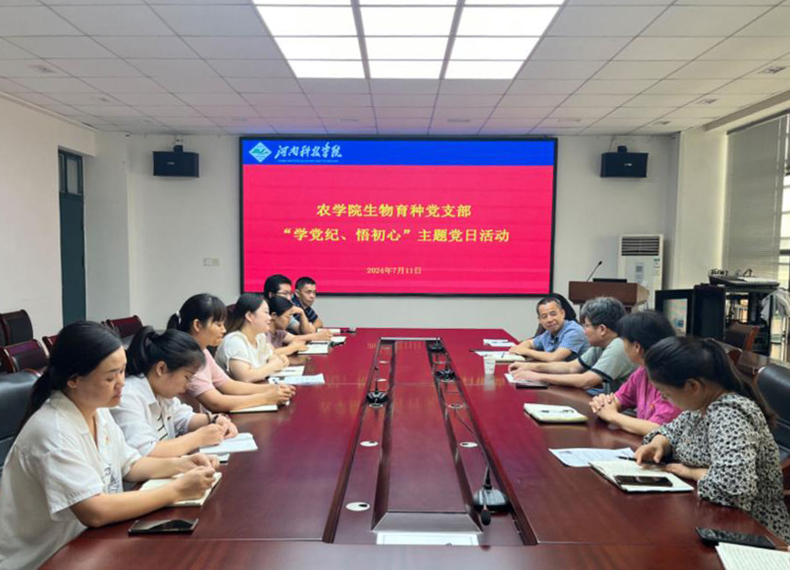 为了进一步推动党纪学习教育走深走实,认真落实学校党委党纪学习教育的要求,农学院生物育种党支部于7月11日上午开展了“学党纪、悟初心”主题党日活动。校长阚云超同志参加支部学习研讨。会议由农学院生物育种党支部书记主持,支部全体党员参加会议。