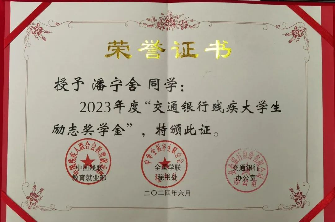 为全面贯彻党的二十大精神,落实习近平总书记关于残疾人事业的重要论述及新时代党的青年工作要求,大力宣传残疾青年自强励志的先进事迹和精神风貌,根据《关于开展2023年度“交通银行残疾大学生励志奖学金”奖励活动的通知》要求,经学校报送、省残联、学联共同推荐,近日,中国残联教育就业部、全国学联秘书处发布了2023年度交通银行残疾大学生励志奖学金名单。我校数学科学学院数学213班潘宁舍喜获2023年度“交通银行残疾大学生励志奖学金”,本年度河南省仅有2人获得此荣誉。