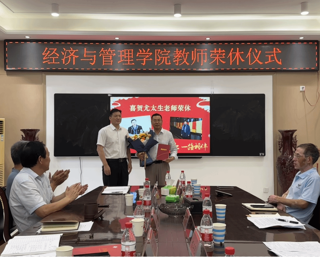 7月25日下午,经济与管理学院在10号教学楼202会议室举行尤太生老师荣休仪式。校党委副书记、工会主席姚刚出席荣休仪式,统战部、图书馆、艺术学院等单位相关同志,学院班子成员及教师代表参加仪式。