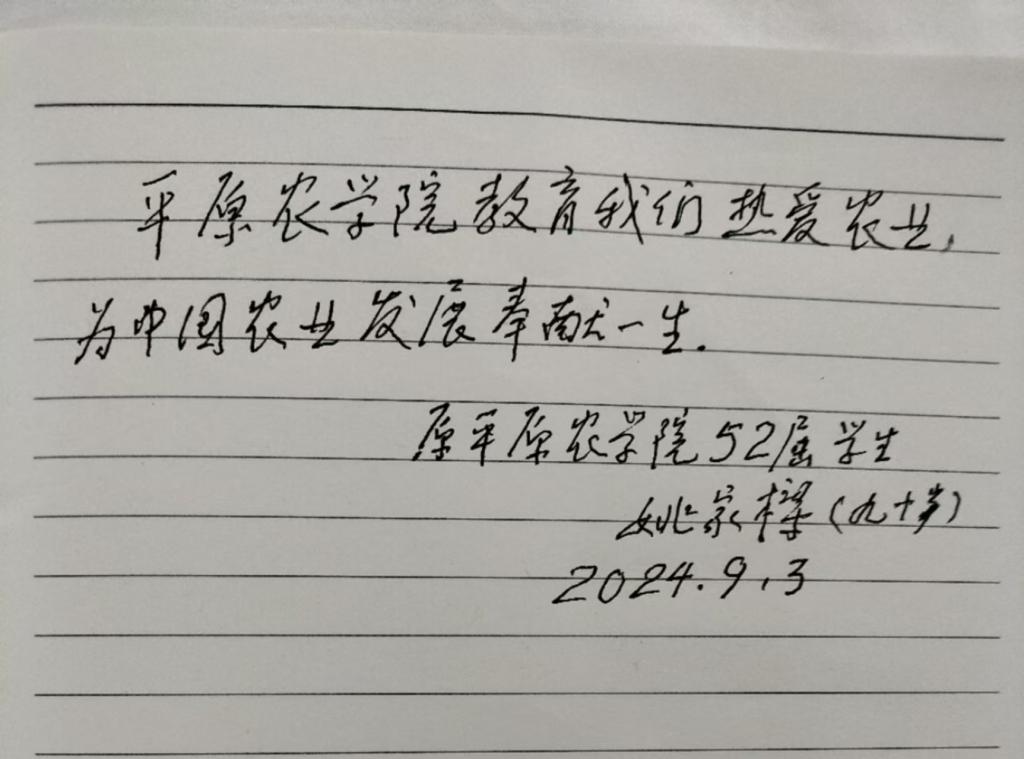 宋亚伟看望了我校平原农学院时期1952级校友、90岁的姚家樑,代表学校向他表示亲切祝福和问候。姚家樑校友对宋亚伟的关心表示特别地感谢,对母校日新月异的发展,由衷赞叹。他动情地回忆起在平原农学院读书、学习的激情岁月,和有关老师对自己的教育,并拿出珍存的通讯录,一一回忆、找寻目前还健在的数位同学。姚家樑为母校留言祝福:平原农学院教育我们热爱农业,为中国农业发展奉献一生。