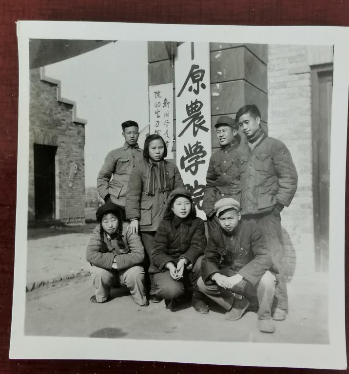 黄岁新女士(红军将领黄公略的女儿,中间站立者)在平原农学院大门前的留影