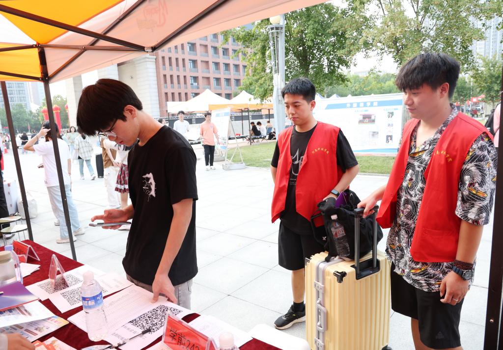 在新生接待点,学校融合铸魂育人要素,将“开学第一课”搬到了迎新现场,通过一块块爱国主义、反邪教宣传、宗教政策法规宣传、校史校训、资助知识、心理健康等内容的展板宣传等,将思政教育、安全教育、校史教育等融入迎新现场,帮助新生迈好入学第一步,让新生的“开学第一课”更加扎实有效。