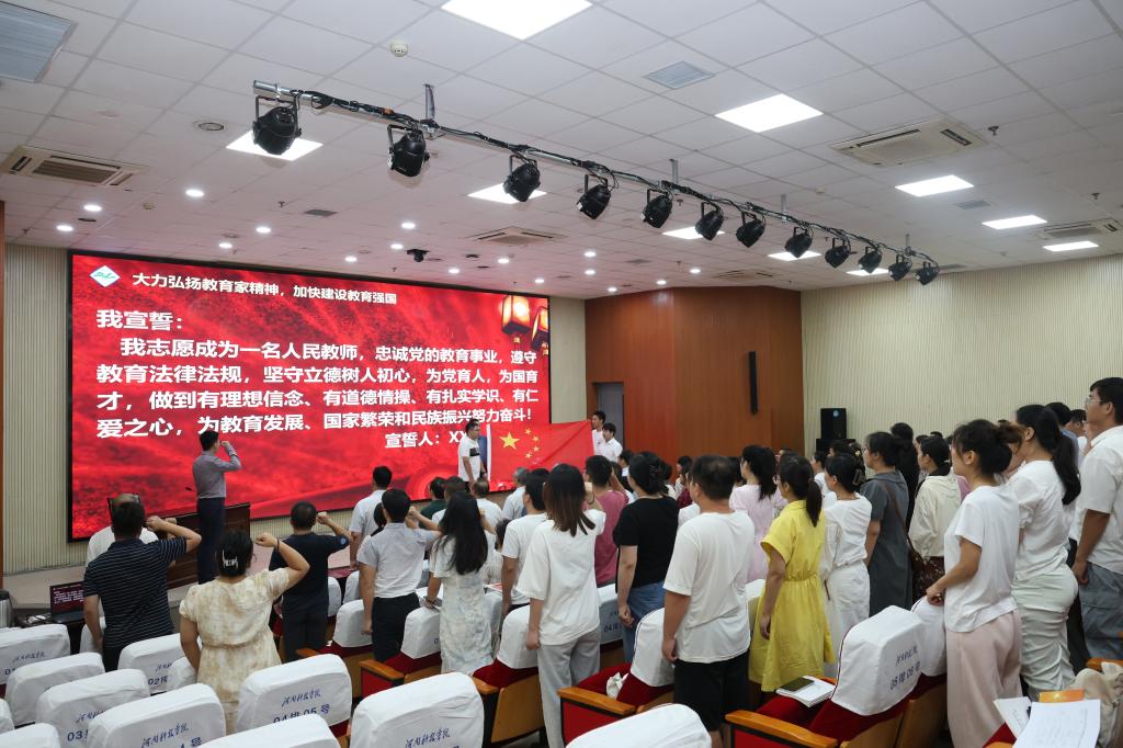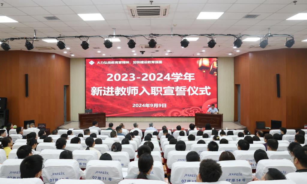 9月9日下午,在第40个教师节来临之际,我校在图书馆一楼报告厅举办2023-2024学年新进教师岗前培训开班仪式暨师德第一课活动。校党委书记宋亚伟出席并讲话。党委组织部、人事处、教务处、科技处、研究生处、财务处、教学质量监控中心、教育科学学院等部门负责人参加活动。活动由副校长胡铁柱主持。