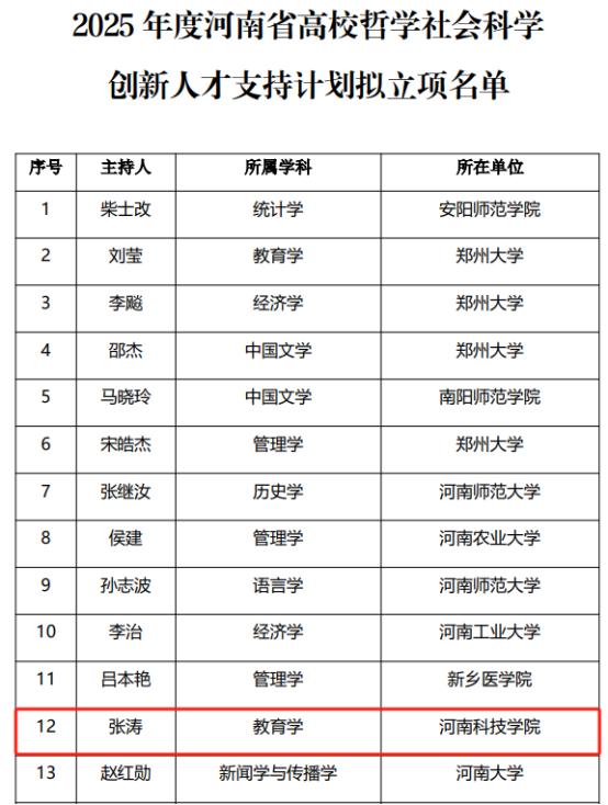 近日,中共河南省委教育工委、河南省教育厅下发了《河南省教育厅办公室关于申报2025年度河南省高等学校哲学社会科学创新人才支持计划的通知》(豫教工委〔2024〕16号),我校教学质量监控中心张涛副教授入选。
