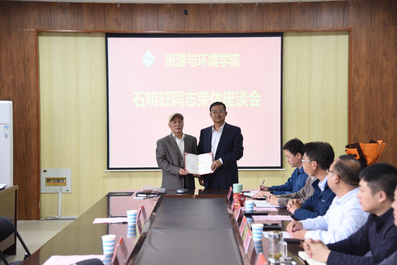 仪式伊始,贺杰为石明旺教授颁发荣休证书。资源与环境学院负责人宣读了学校《关于石明旺教授荣休的通知》,教师代表为石明旺教授献花。