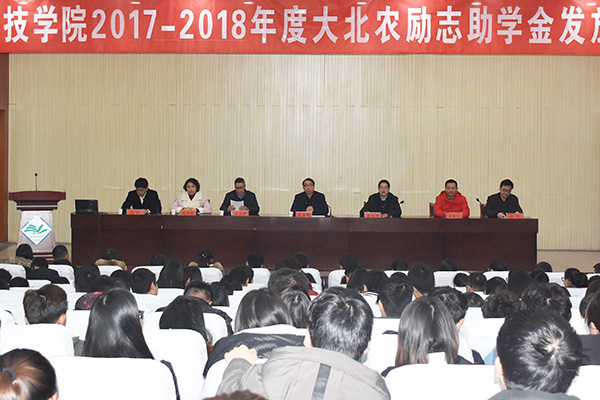1月9日下午,2017-2018年度大北农励志助学金发放仪式在我校图书馆一楼报告厅举行。学生处、相关学院及大北农集团河南特区负责人参加了仪式。