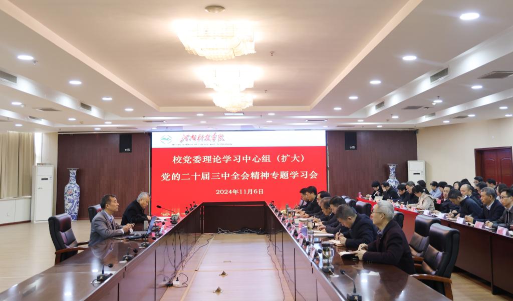 11月6日上午,我校在办公楼206会议室举行校党委理论学习中心组(扩大)党的二十届三中全会精神专题学习会。会议邀请省委党的二十届三中全会精神宣讲团成员、河南师范大学蒋占峰教授,就深入学习贯彻党的二十届三中全会精神作辅导报告。校党委理论学习中心组成员、各职能部门负责人和二级党组织书记参加会议。