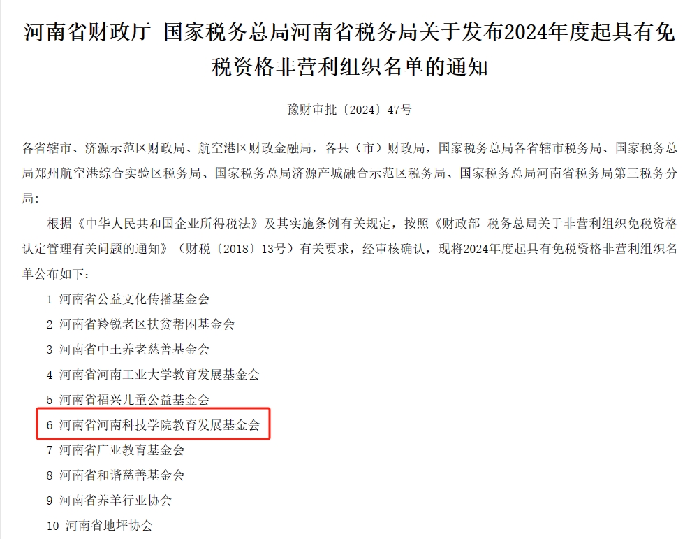 11月14日,河南省财政厅、国家税务总局河南省税务局联合下发《关于发布2024年第一批获得免税资格的省属非营利组织名单的通知》(豫财审批〔2024〕47号),河南省河南科技学院教育发展基金会名列其中,获得2024-2028年非营利组织免税资格。