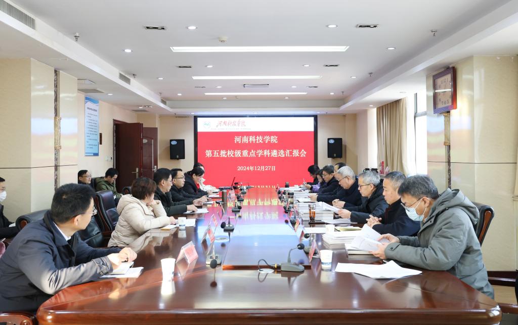 12月27日,我校在办公楼901会议室举行第五批校级重点学科遴选汇报会。副校长马金友担任评审组长,教务处、科技处、学生处、学科建设处、国际交流合作处、实验室与设备管理处、成果转化与合作办公室等部门负责人担任评委,各申报学科带头人和相关学院负责人参加会议,会议由研究生处、学科建设处负责人主持。