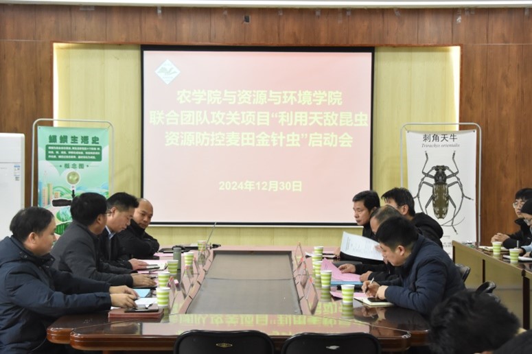 12月30日,农学院和资源与环境学院校内团队合作项目“利用天敌昆虫资源防控麦田金针虫”启动会在实验楼E307会议室举行。副校长丁轲出席会议,科技处、农学院、资源与环境学院负责人,合作团队成员30余人参加会议。