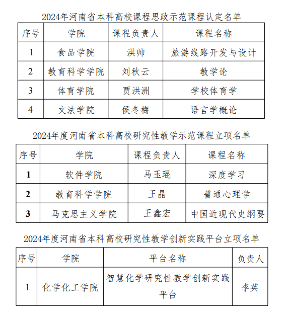 近日,河南省教育厅下发《河南省教育厅办公室关于公布河南省2024年本科高校课程思政示范课程认定名单的通知》和《河南省教育厅关于公布2024年度河南省本科高校研究性教学示范课程和创新实践平台立项名单的通知》,我校成功获批了《旅游线路开发与设计》等4门课程思政示范课程和《普通心理学》等3门研究性教学示范课程,同时立项建设“智慧化学研究性教学创新实践平台”1个。