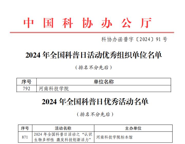 近日,中国科协办公厅印发《关于对2024年全国科普日有关组织单位和活动予以表扬的通知》(科协办函普字〔2024〕91号),我校荣获2024年全国科普日活动优秀组织单位,由我校组织申报的“认识生物多样性 激发科技创新活力”主题活动获评2024年全国科普日优秀活动,这是我校首次获此殊荣。
