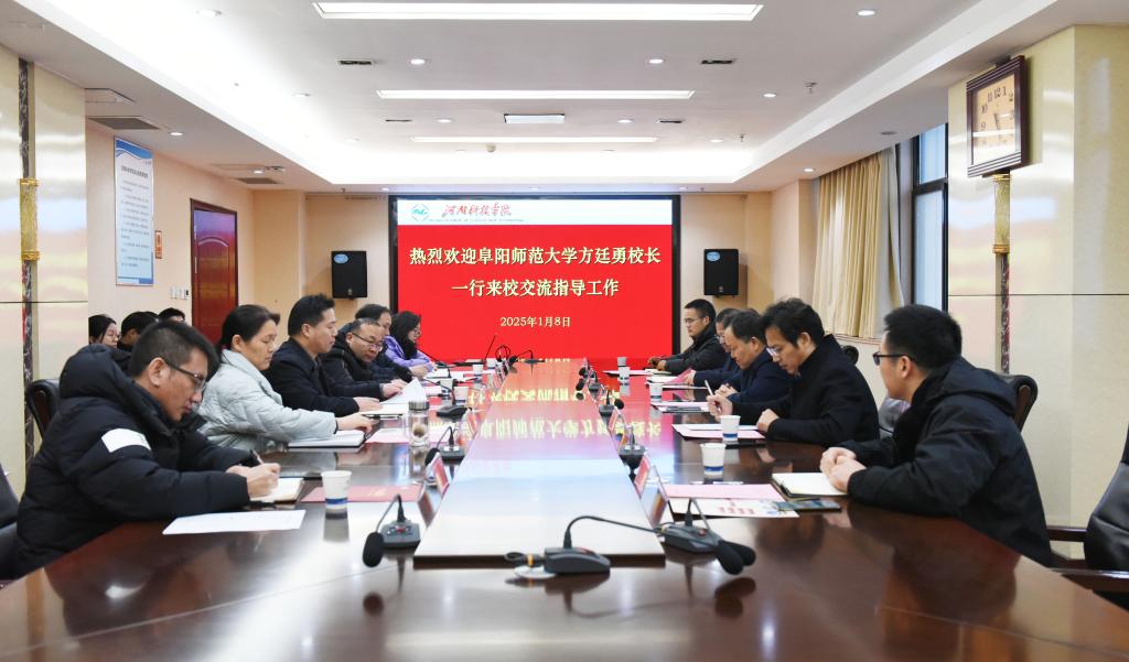 1月8日下午,阜阳师范大学校长方廷勇一行来我校考察交流,校长阚云超亲切会见。双方在办公楼901会议室举行交流座谈会,副校长丁轲,科技处、成果转化与合作办公室相关负责人参加会议,会议由科技处负责人主持。