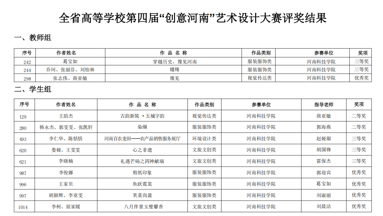 近日,全省高等学校第四届“创意河南”艺术设计大赛圆满落幕,我校师生在此次大赛中表现出色,荣获多个奖项,充分展示了我校在艺术教育领域的实力和创新能力。
