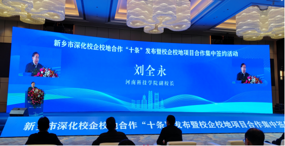 刘全永作为驻新高校代表进行了发言,他介绍了我校的优势特色和校企合作方面的主要措施。一是突出重大项目平台建设,学校以申报获批的中原智能医学省实验室作为新乡创新与转化的主要研发平台之一,推进生物大数据驱动的生命医学知识发现及转化应用。二是突出科技创新支撑,先后培育了以“百农4199”、“百农207”等为代表的小麦、玉米、棉花等新品种20余个,累计增产效益超200亿元,为打造新乡国家农业创新高地做出了突出贡献。三是突出成果转化与横向合作,积极参与粮食安全、食品健康、装备智造等领域的成果转化与合作,先后与50余家规上企业共建了校企研发中心,近五年成果转化与横向合作项目300多项,经费达1.35亿元。四是突出科技服务地方经济发展,学校认真贯彻落实省委省政府决策部署,做好特派员选派,共创社会经济效益100亿元以上,为农民增产增收和乡村振兴事业作出重大贡献。