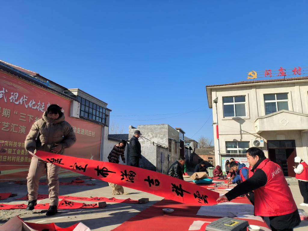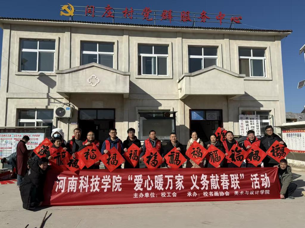 “灵蛇报春晓,瑞气满人间”,为弘扬中华优秀传统文化,营造温馨热闹的节日气氛,由河南科技学院工会主办,校书画协会、美术与设计学院承办的“爱心暖万家,义务献春联”文化下乡活动在我校定点帮扶单位闫庄村火热开展。