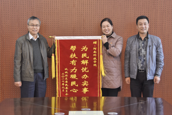 10月24日,新乡市诚城社区主任李凤林等一行三人将一面绣有“为民解忧办实事 帮扶有力暖民心”的大红锦旗送到学校,深切地表达了诚城社区·进达花园居民对我校帮扶社区创文工作的感激之情。