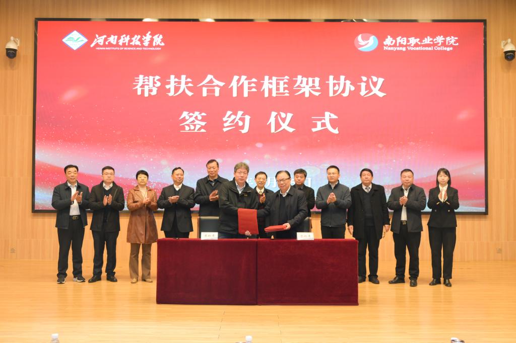 3月15日上午,河南科技学院与南阳职业学院对口帮扶合作框架协议签约仪式在南阳市西峡县举行。校长阚云超、副校长乐玉忠,南阳职业学院党委书记魏文君、校长郭健生、执行校长董联军、党委副书记兼工会主席郭书贤,西峡县人民政府副县长崔淅州出席仪式。我校发展规划处、人工智能学院负责人,南阳职业学院全体中层干部参加。仪式由郭书贤主持。