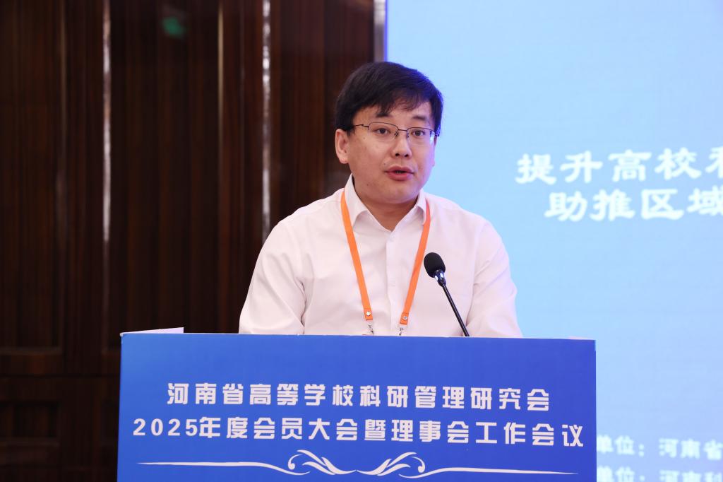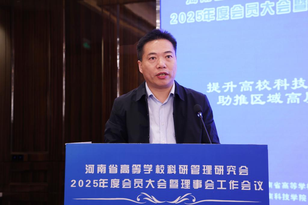 阚云超在致辞中对与会领导和代表表示欢迎,并介绍了学校的办学历史,表示学校坚持办学特色,扎根中原沃土,书写科研创新的“科院答卷”,探索科研管理的“科院实践”,贡献科研强省的“科院智慧”,将以更科学的科研管理,赋能科技创新高质量发展。