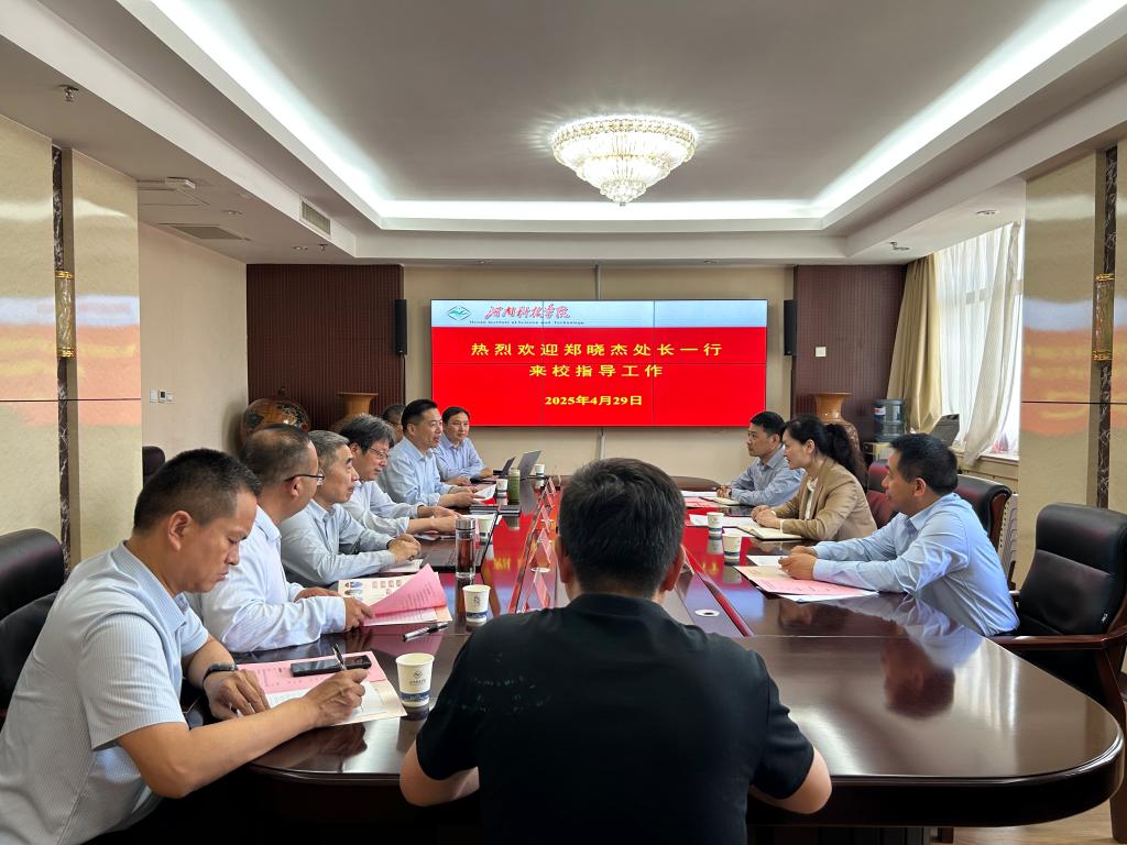 4月29日下午,省农业农村厅科技教育处郑晓杰一行3人就国家主粮作物智慧绿色高效种植技术集成及应用示范基地建设来我校调研交流。校长阚云超、副校长丁轲出席会议,科技处、百泉现代农业研究院、广西田园生化股份有限公司负责人参加会议。会议由丁轲主持。
