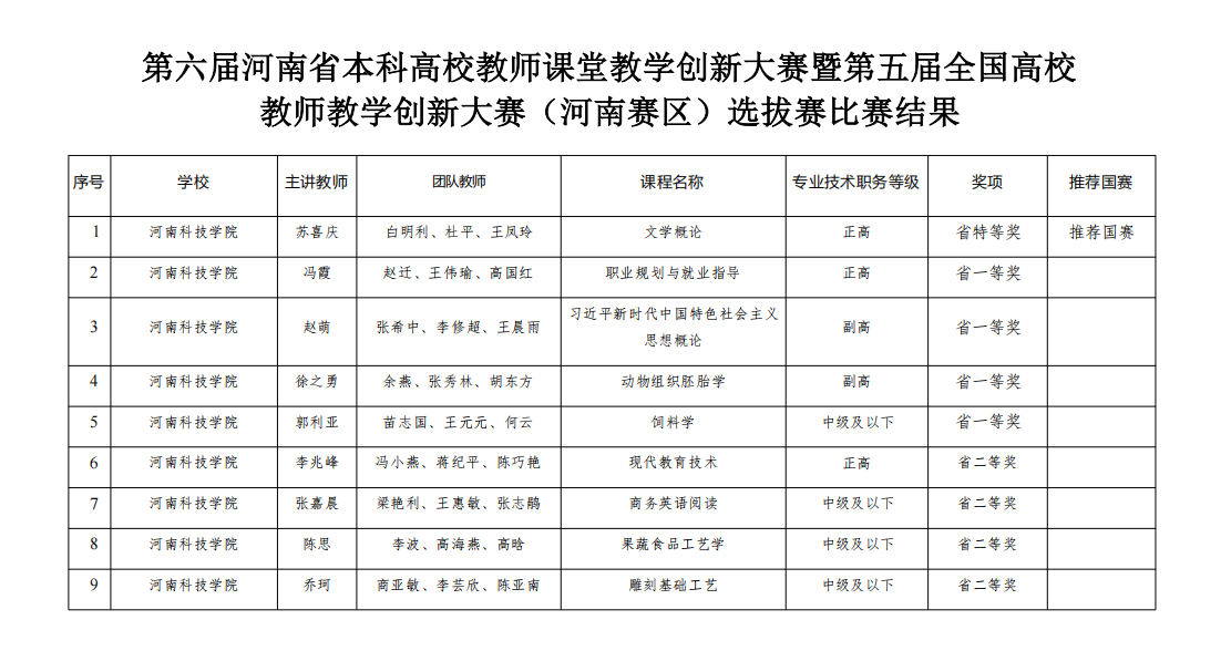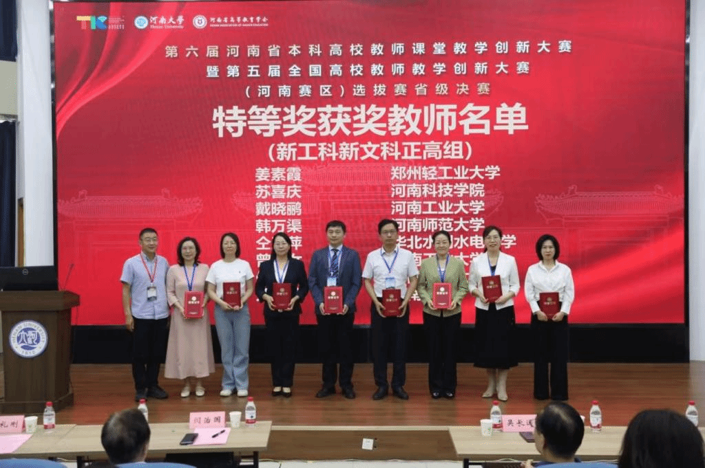 第六届河南省高校教师教学创新大赛由河南省教育厅主办,以“推动教学创新 培养一流人才”为主题,聚焦基础课程、“四新”建设、课程思政、产教融合等领域,历经校级初赛、省级复赛、省级决赛,共决出特等奖50个、一等奖127个、二等奖176个,其中,推荐25名特等奖教师参加国赛。
