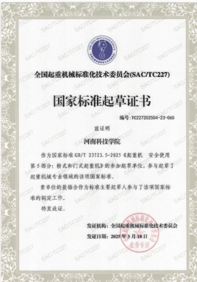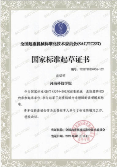 近日,我校机电学院聂福全教授作为主要起草人参与制定的《起重机械危险源辨识》、《起重机械安全使用》两项国家标准,获得全国起重机械标准化技术委员会批准发布,填补了我校在起重机械国家标准制定领域的空白。