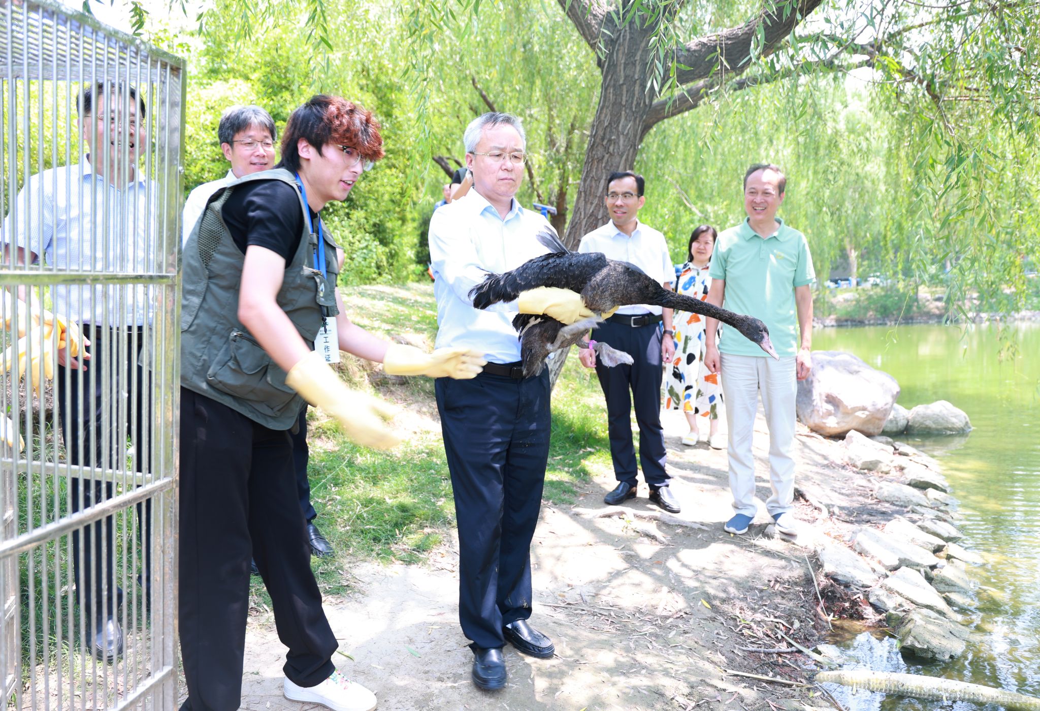 7月17日,受伤黑天鹅经过专业人员的悉心照料与救治后,在河南科技学院东湖畔成功放归大自然。校党委书记宋亚伟、校长阚云超、副校长丁轲到场观看,并就进一步加强野生动物救护工作作出指示。这是我校与新乡市林业局共建“新乡市野生动物收容救护和监测中心”挂牌成立后救护成功的第一批野生动物。