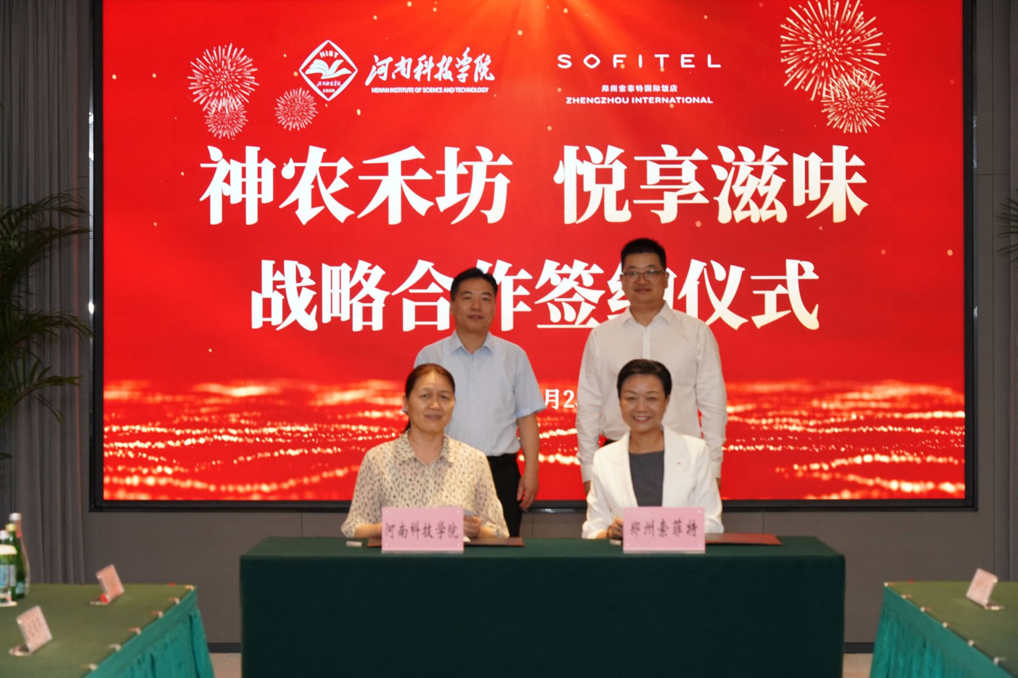 成果转化与合作办公室负责人与郑州索菲特国际饭店总经理余跃红代表双方签署战略合作框架协议,双方携手,深入贯彻落实健康中国和可持续发展国家战略,积极践行“食育”理念,推动校地资源深度融合。