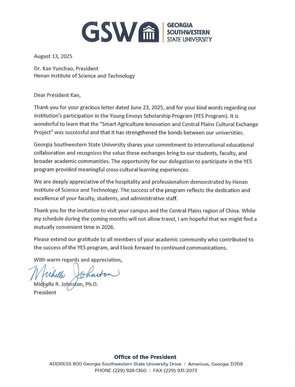 近日,我校收到美国西南佐治亚州立大学校长米歇尔·R·约翰斯顿(Michelle R. Johnston)的感谢信。她在信中充分肯定了我校与佐治亚西南州立大学联合举办的“智慧农业工程创新与特色中原文化发展”青年交流使者交流项目(Y.E.S 项目)对促进跨文化学习的重要意义,对我校的热情接待和专业组织表示感谢,并明确提议在2026年寻找合适时机,进一步推动两校合作。